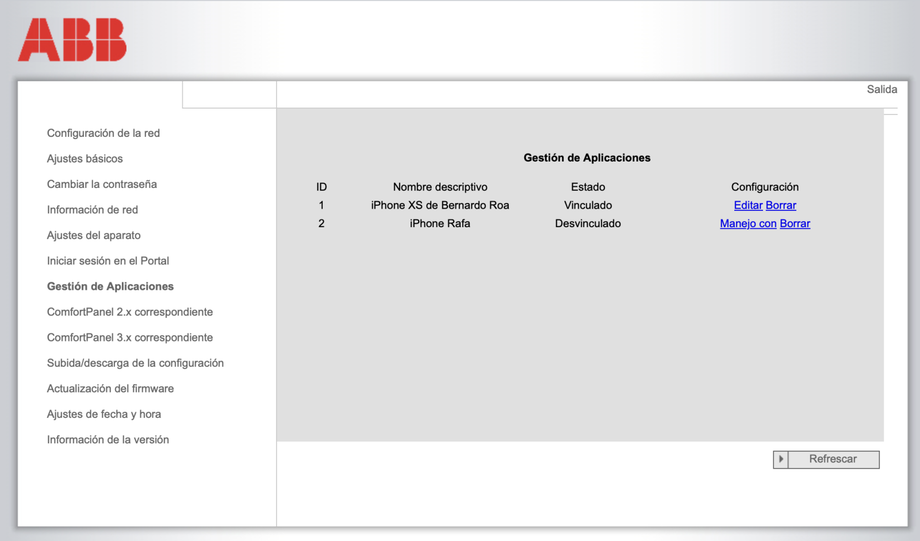 Nos vamos al apartado de "Gestión de Aplicaciones" para ver los dispositivos vinculados. El máximo son 5 dispositivos. Aparecerá un dispositivo cuyo estado es desvinculado, que es el que acaba de pedir vincularse. Al pulsár sobre "Manejo con..." aparece esta pantalla: