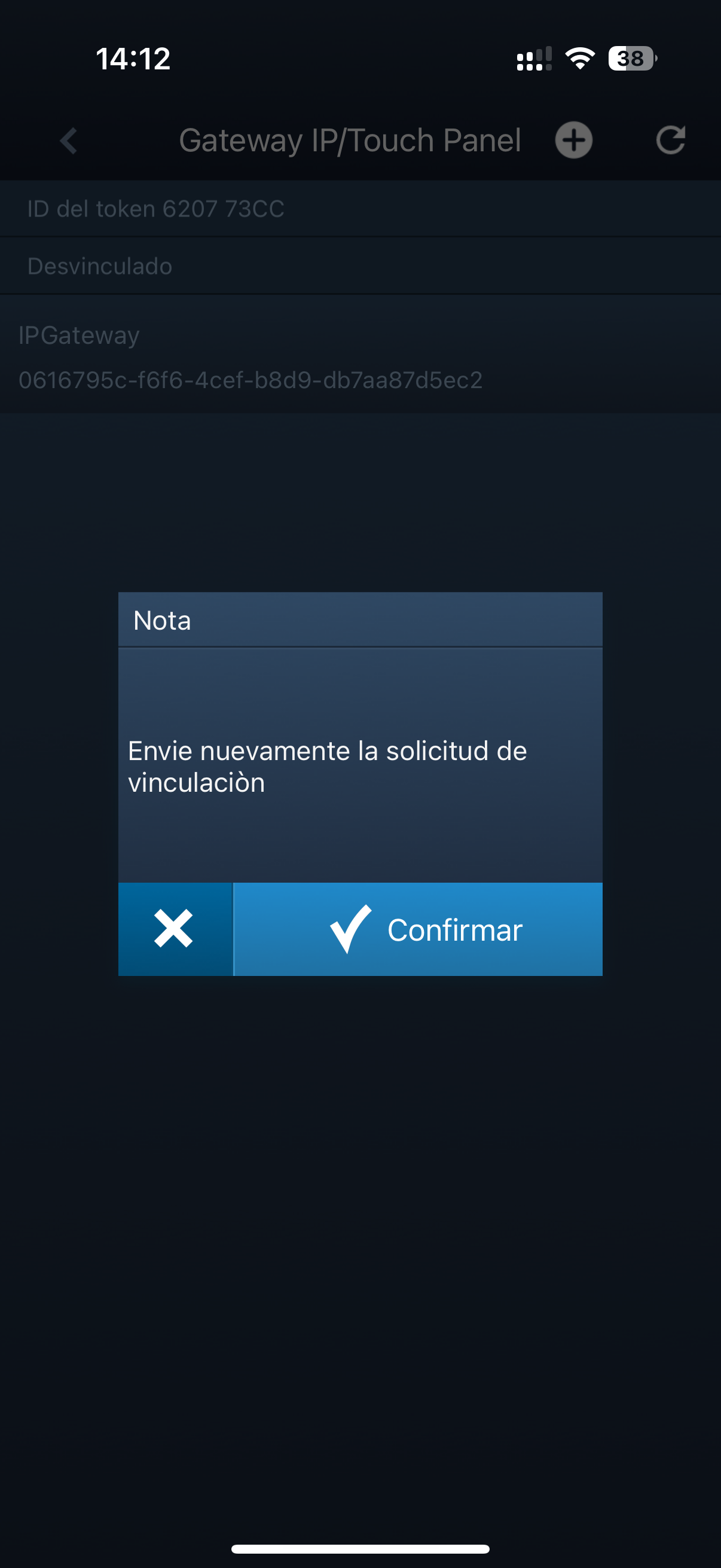En esta pantalla hay dos cosas importantes, por un lado el ID del token que necesitaremos más adelante y por otro lado dónde pone "IPGateway" es, en realidad, un botón para comenzar el emparejamiento. Se pulsa y se le da a "Confirmar"