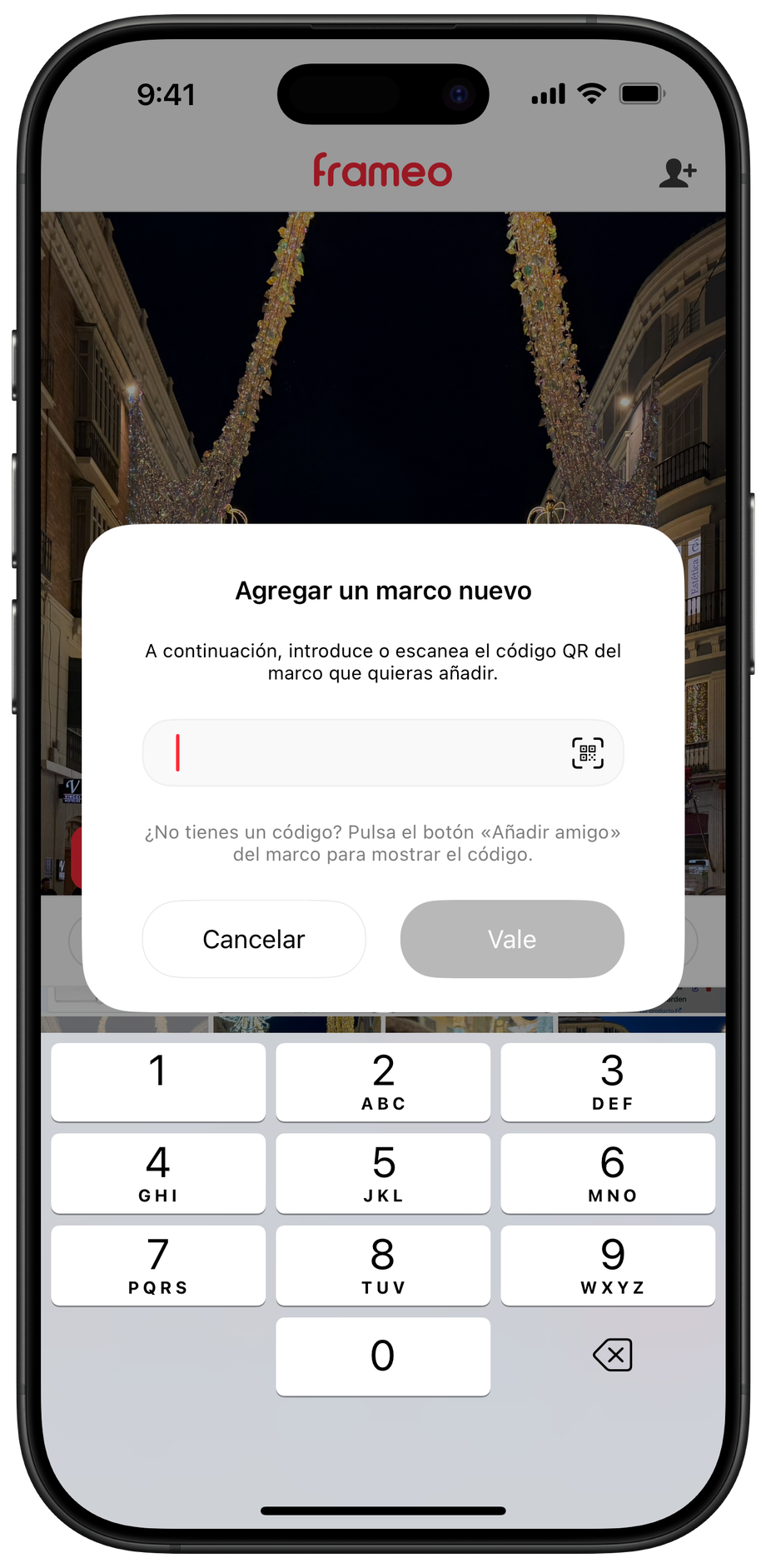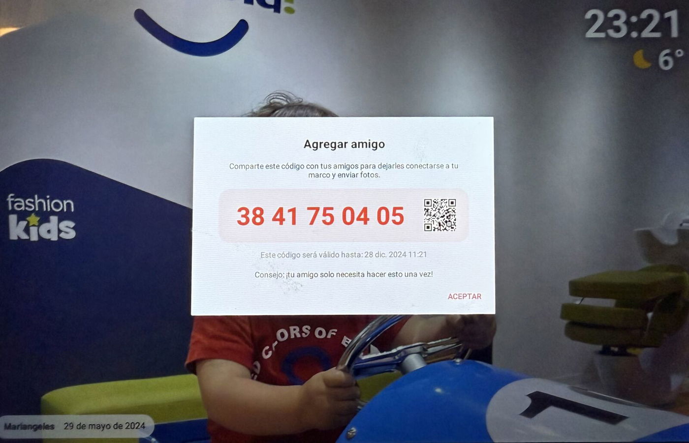 Aparecerá esta pantalla, en la que puedes poner los números que ves en el marco de fotos o bien, pulsando en el icono del código QR que hay a la derecha, podrás apuntar a la pantalla del marco para que se conecte.