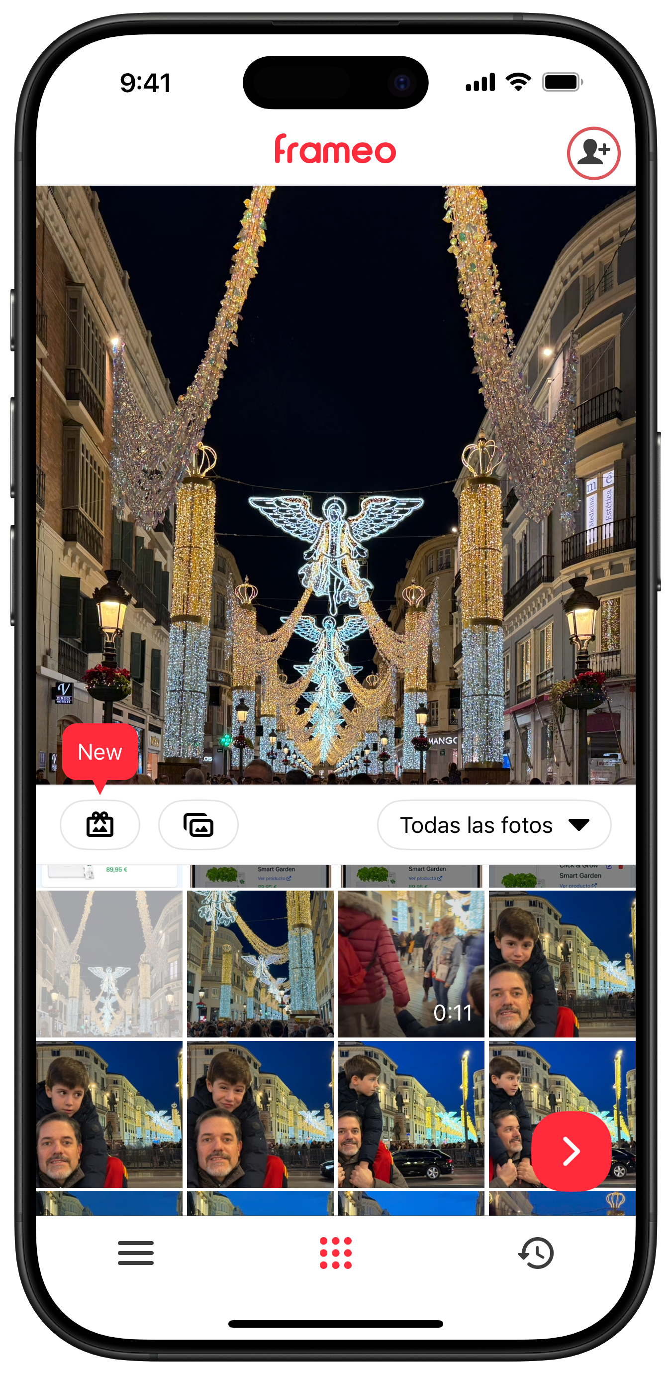 Al añadir un usuario a tu marco de fotos, permites que esta persona pueda enviar fotografías o videos desde su móvil a tu marco de fotos. Primero tendrás que crear una invitación en el marco y luego añadir el marco en el teléfono: