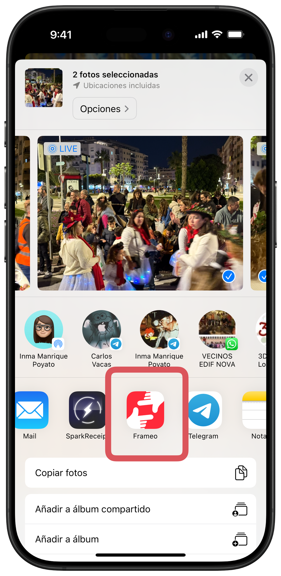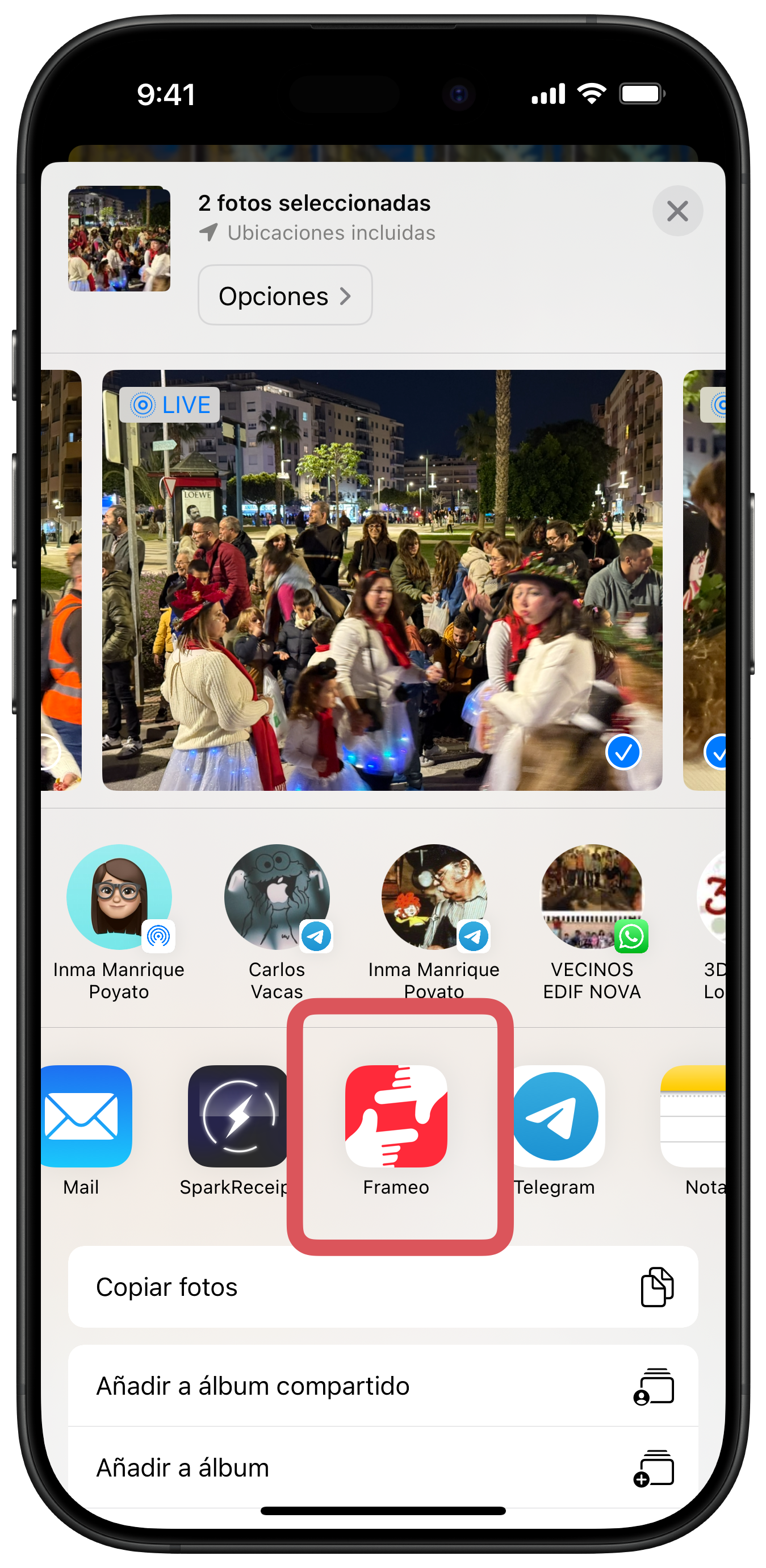 En lugar de abrir la app, selecciona las fotos en la aplicación de fotos de tu teléfono y luego pulsa en compartir. Busca la aplicación Frameo y pulsa sobre ella. El resto de pasos es igual que desde la aplicación de Frameo.